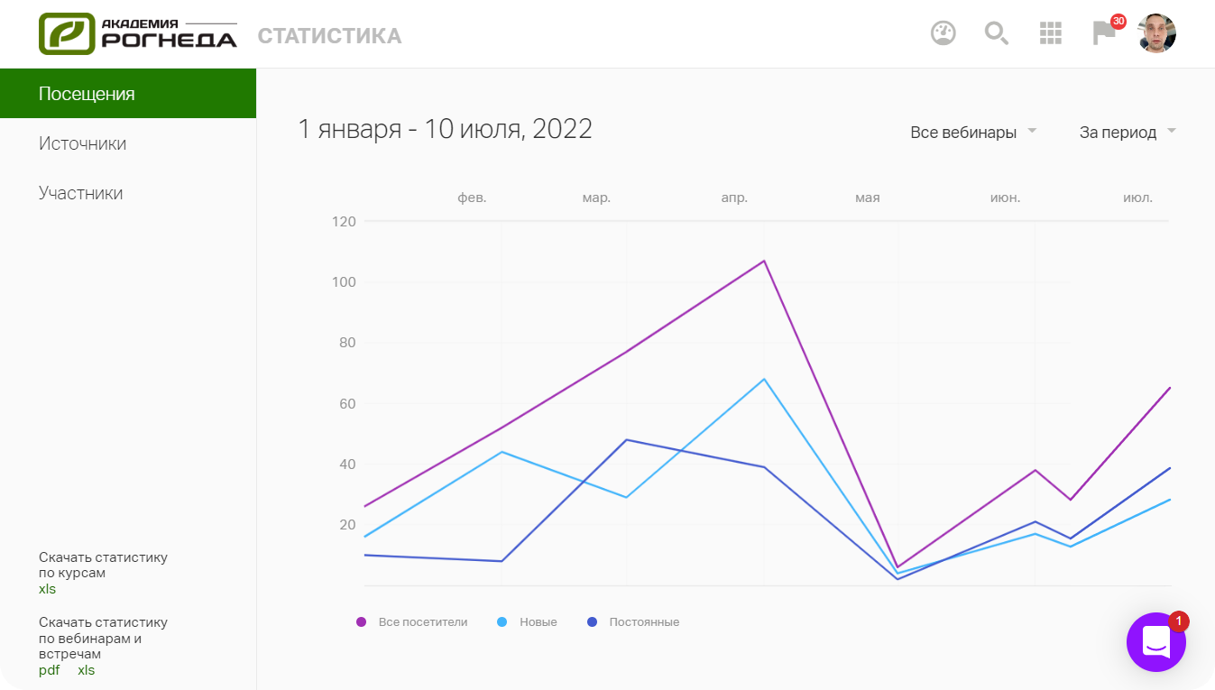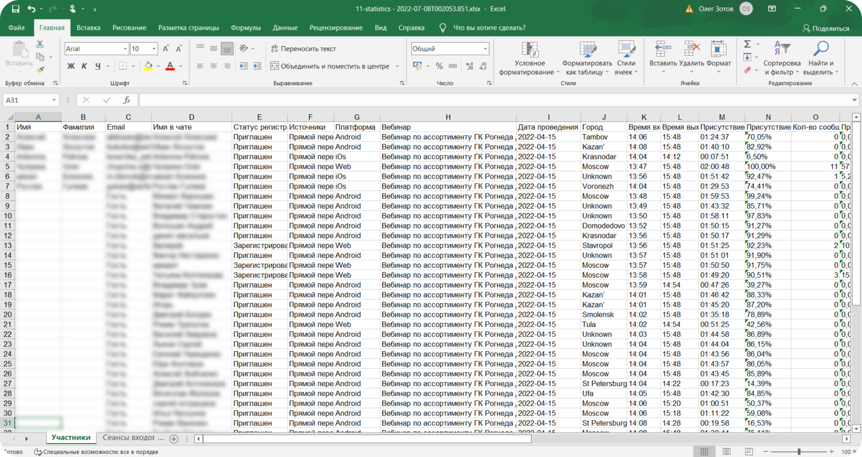 Подробная статистика участников доступна в формате xls в личном кабинете платформы Вебинары
