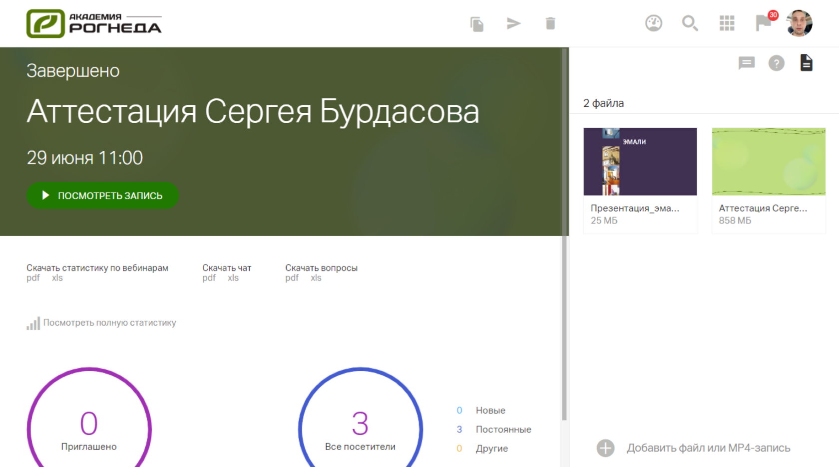 Сохраненные записи онлайн-мероприятий компании «Рогнеда» доступны в личном кабинете в разделе «Файлы»