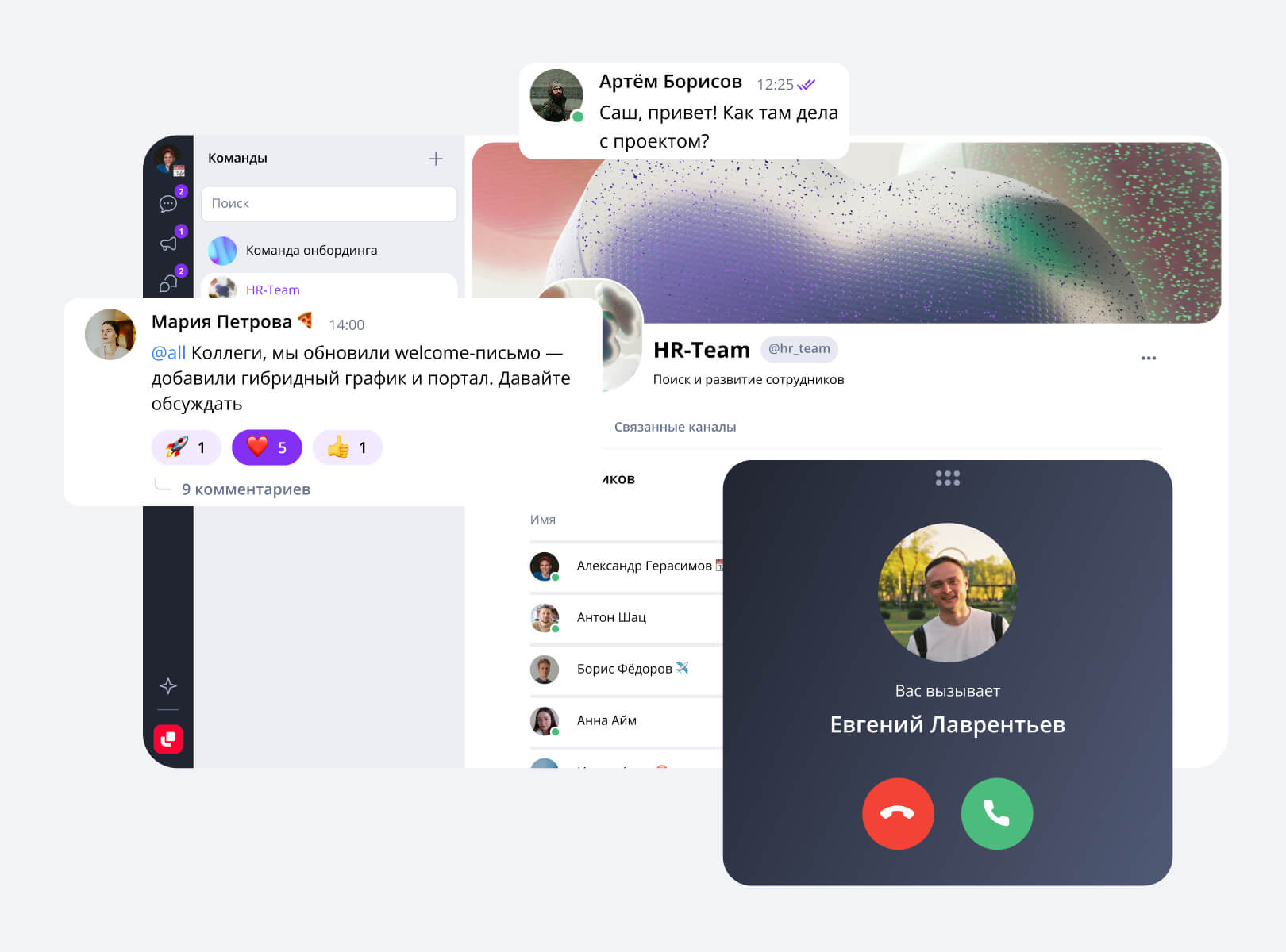 Общайтесь в чатах и групповых беседах и созванивайтесь прямо в мессенджере