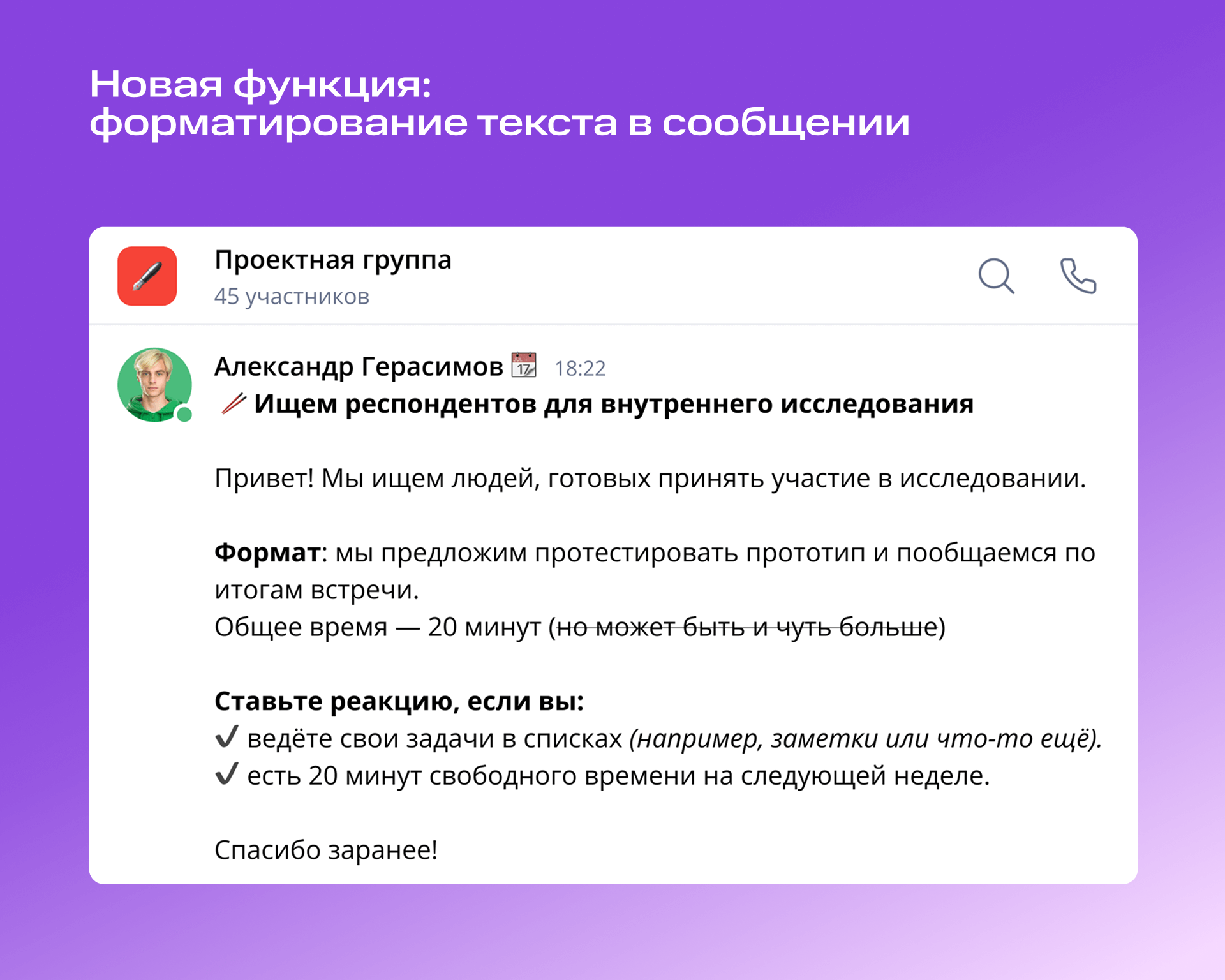 Создавайте визуальную структуру сообщений и превращайте даже длинный текст в легко воспринимаемый. Теперь вы можете изменять начертания шрифта: делать его жирным, курсивом и зачёркнутым.