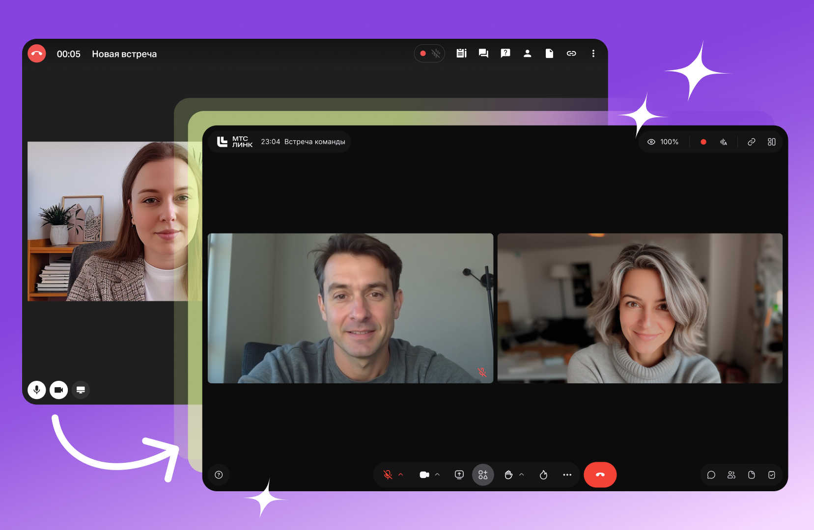 Обновили интерфейс, чтобы вы легко управляли мероприятием в вебе и на десктопе. Все возможности сервиса остались на месте, но теперь показать экран, поделиться ссылкой или завершить звонок можно на 68% быстрее, чем раньше. Как мы создавали интерфейс можно узнать в статье.