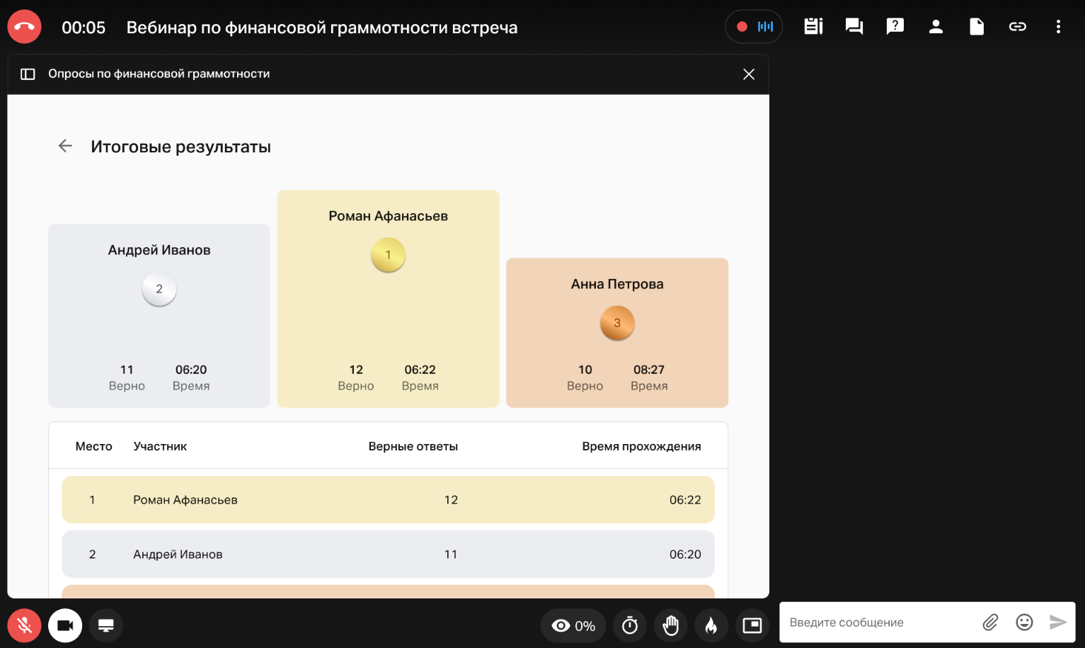 - Проверка знаний в реальном времени. Запускайте тест после каждого блока информации, а итоги подводите в конце мероприятия