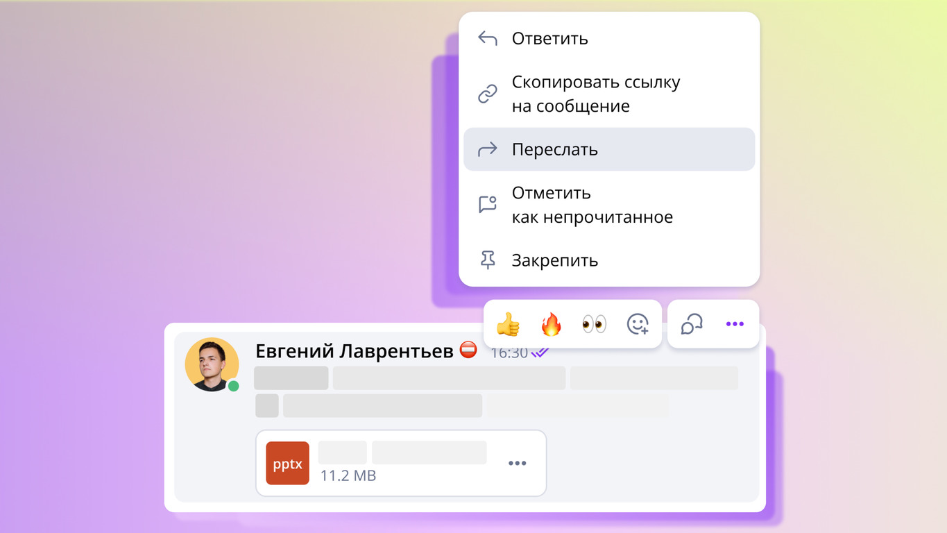 Пересылайте файлы, изображения, контакты между чатами без долгого скачивания и загрузки.