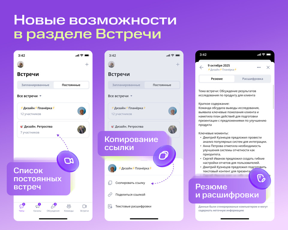 Теперь с телефона легко управлять и подключаться к постоянным встречам, а также просматривать их расшифровки. Откройте раздел «Встречи», чтобы попробовать новые возможности