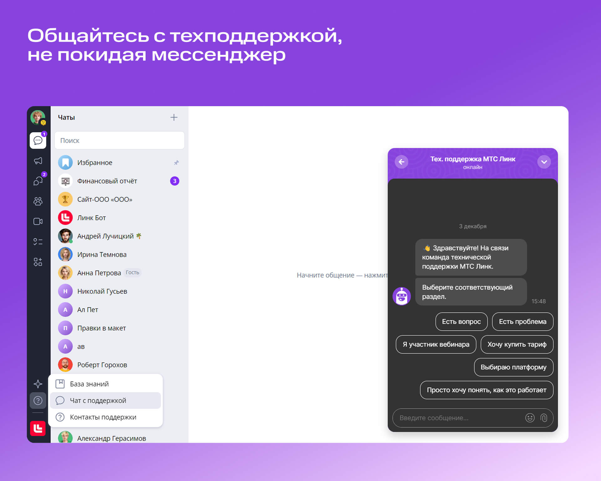 Небольшое, но важное обновление: теперь связаться с технической поддержкой и перейти в базу знаний можно прямо из мессенджера Чаты. Новая кнопка находится в нижнем левом углу и поможет вам быстрее решать возникающие вопросы.